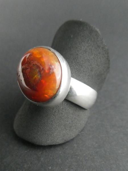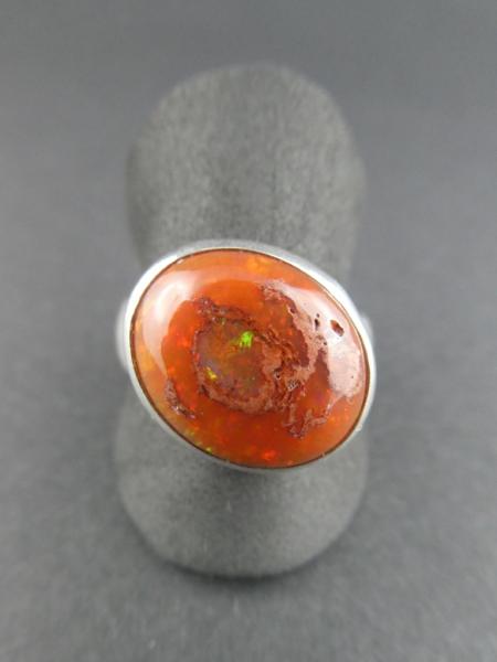 Farbe: mehrfarbig, je nach Lichteinfall schillert der Feueropal überwiegend orange aber auch etwas grün.